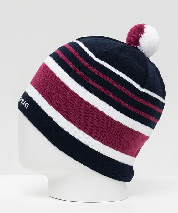 Дизайн с поперечными цветными полосами. Небольшой помпон сделан в цветах шапки. Фирменный логотип выполнен в форме вышивки. Модель представлена в едином размере, который подходит взрослым и подросткам.